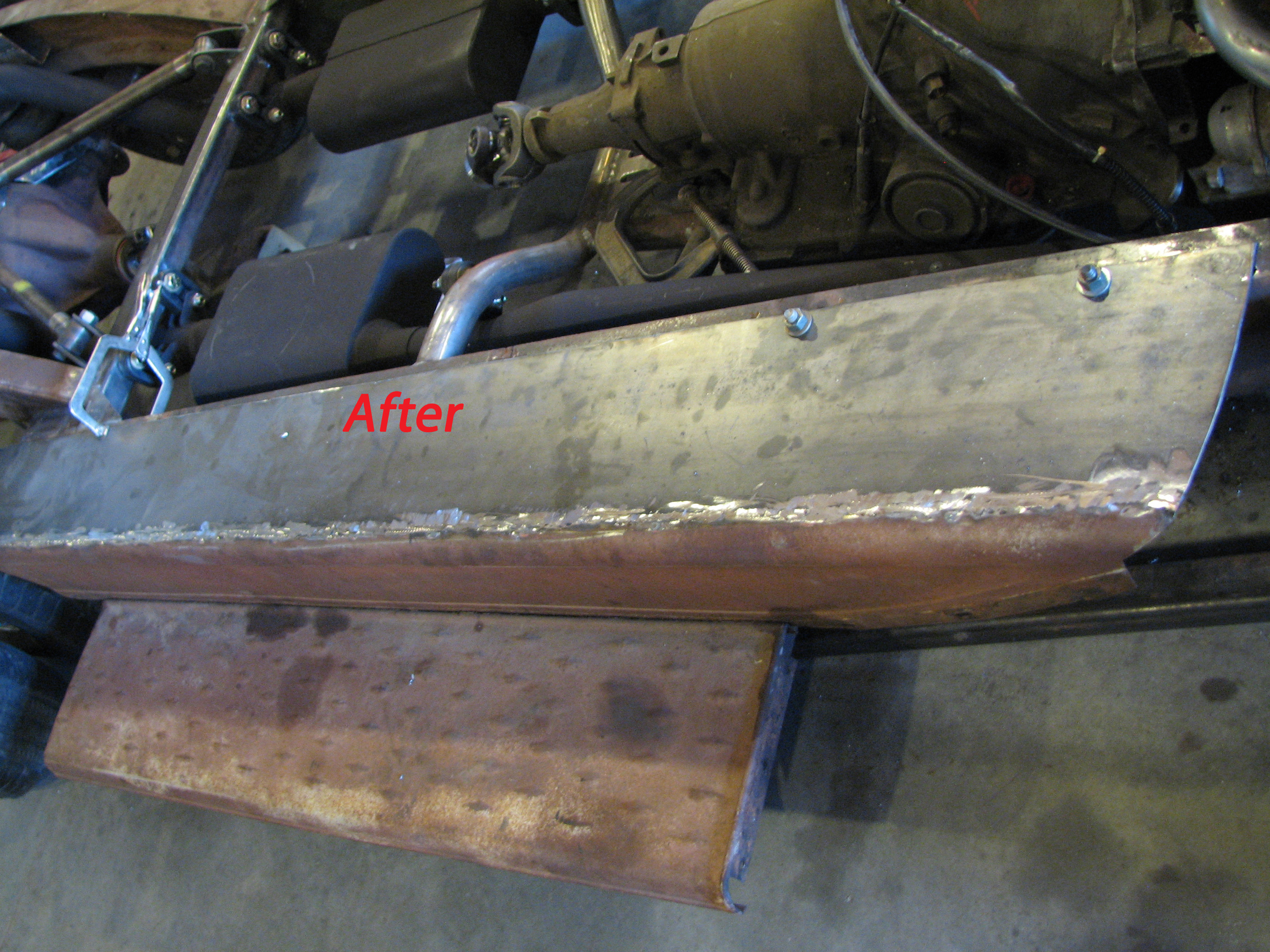 Next was the running board splash apron, originally that was made out of .035" thick steel and since it was in a spot where it could have some weight put on it occasionally I wanted to make it out of .125" thick steel, so I milled a .050" thick step on the top side of the .125" by 8" wide cold finished steel so I could weld the new top and original sides together: (as always, click on thumb for better pic)