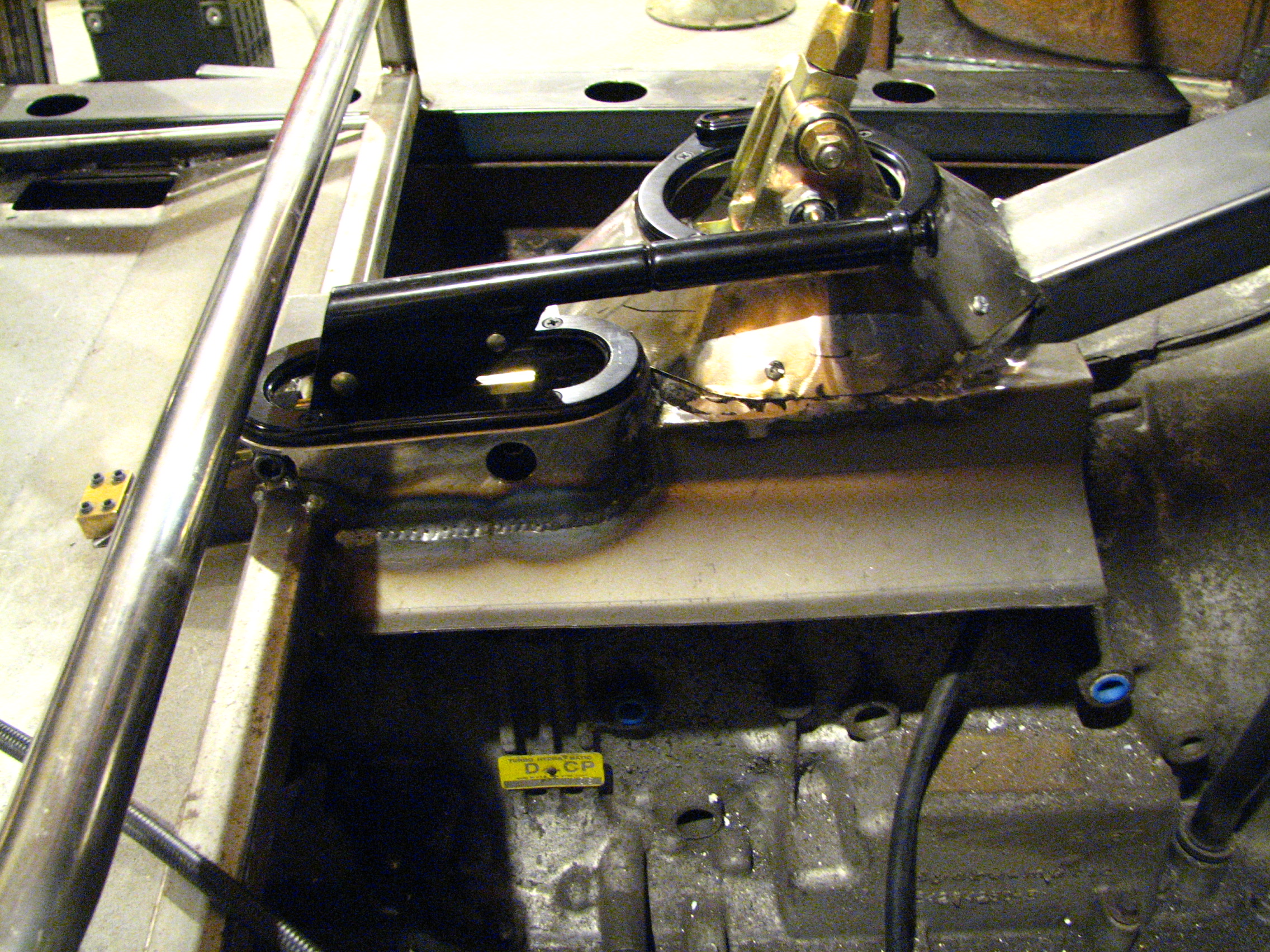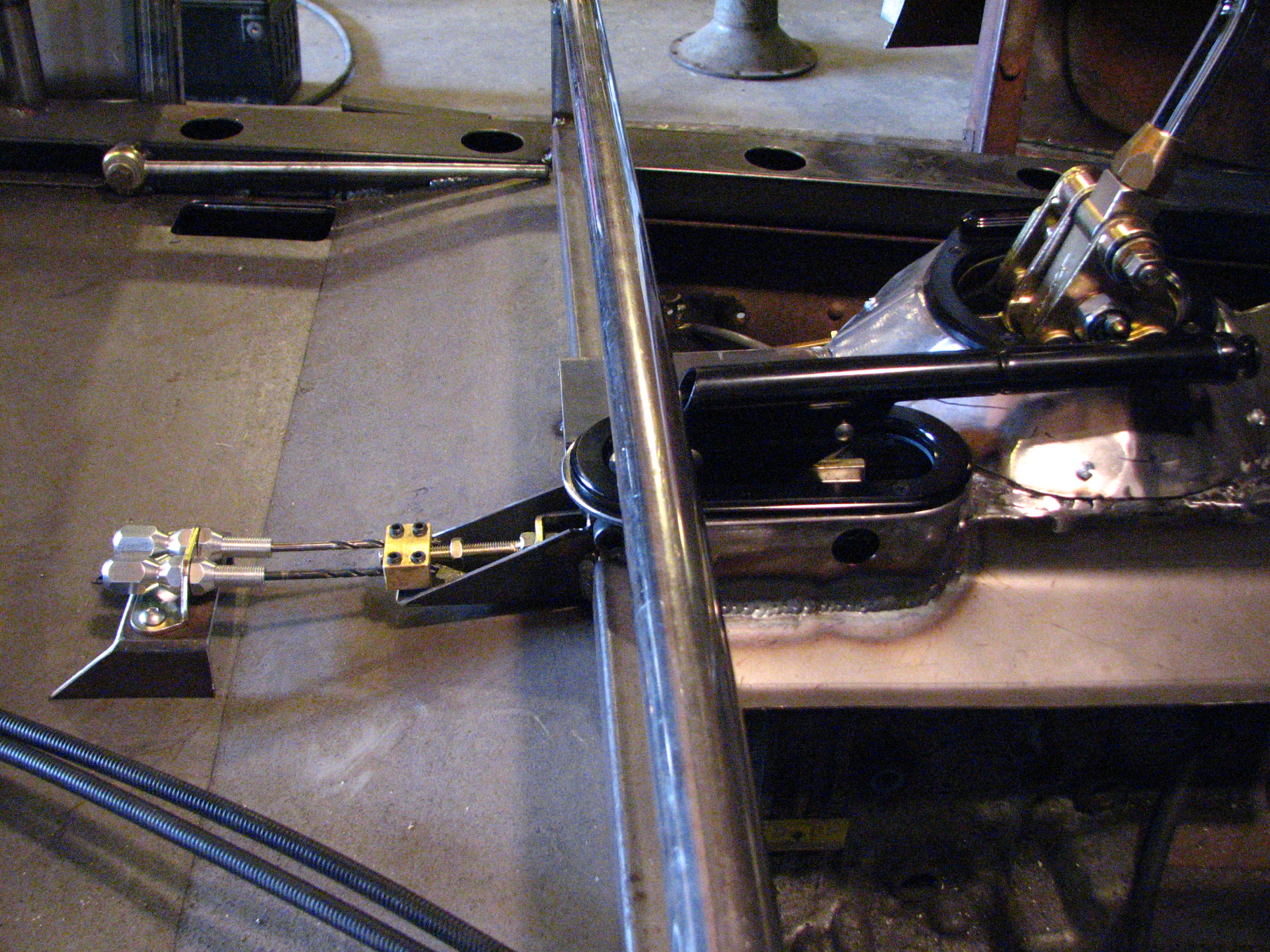 After that I mounted my Lokar Emergency brake which took a little sizing up until I figured out how to get it where it would work best and not be in the way or interfere with legroom, ect., I also built floorboard boot mounts for the E-brake and the shifter, the shifter had to be made removable so I could get the shifter out if I needed to, for the boots themselves they are both Lokar.